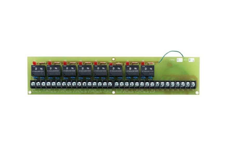 Relay Modules are used to convert HAI voltage outputs to Form C relay contacts for switching pumps, motors, commercial lighting, remote control breakers, and sprinkler systems. This Relay Module provides 8 independent Form C Relays. Contacts rated 5 amps at 24 VDC. LED indicators show which relays are energized. This model has mounting holes.