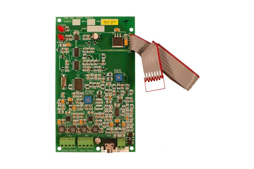 The Model 10A11-1 Two-Way Audio/Voice Alarm Module allows two-way communication with a central station after an alarm, paging and listening from an on-premises or remote phone, annunciation of alarm and zone by voice, and voice messaging (not available on all systems). After an audible alarm, the module allows the central station to control the listen/talk mode. After a silent alarm, the module allows listen in only.